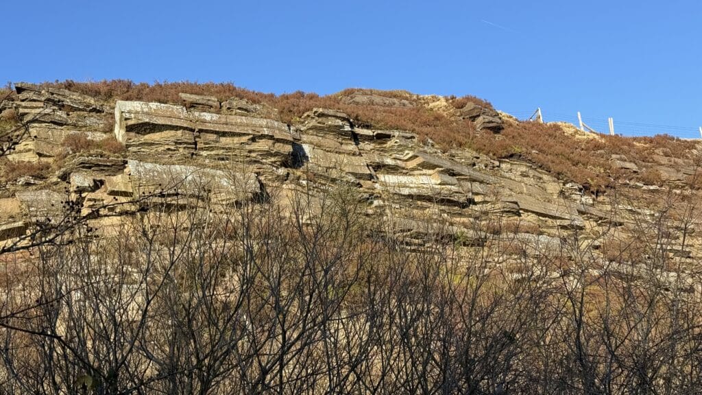 The rocky outcrops around the summit are made from Millstone Grit, a coarse sandstone laid down around 320 million years ago during the Carboniferous period.