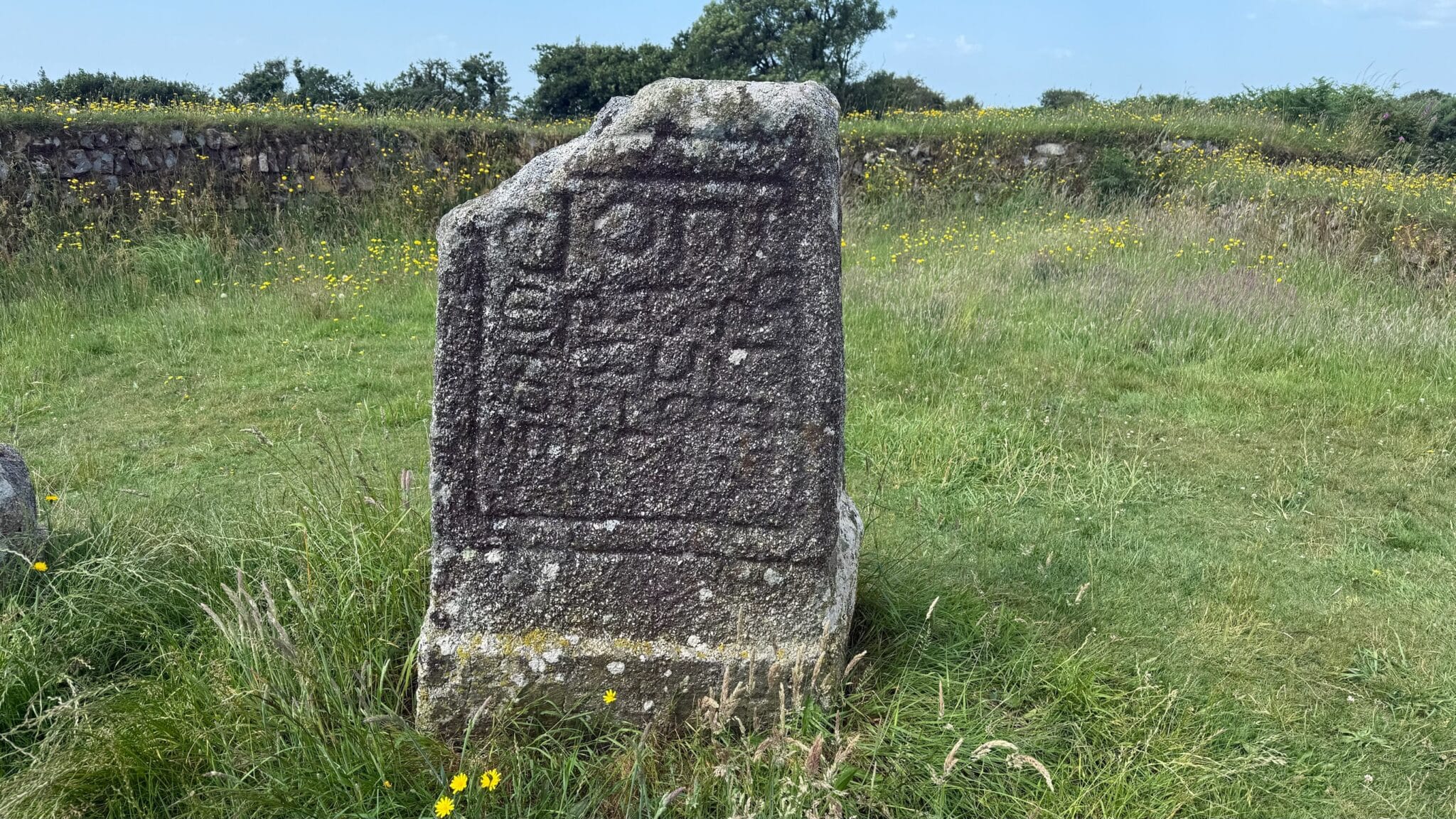 Our journey begins near St Cleer, just outside Liskeard, where two weathered stone shafts stand behind a low stone wall. One of them bears a fading Latin inscription: